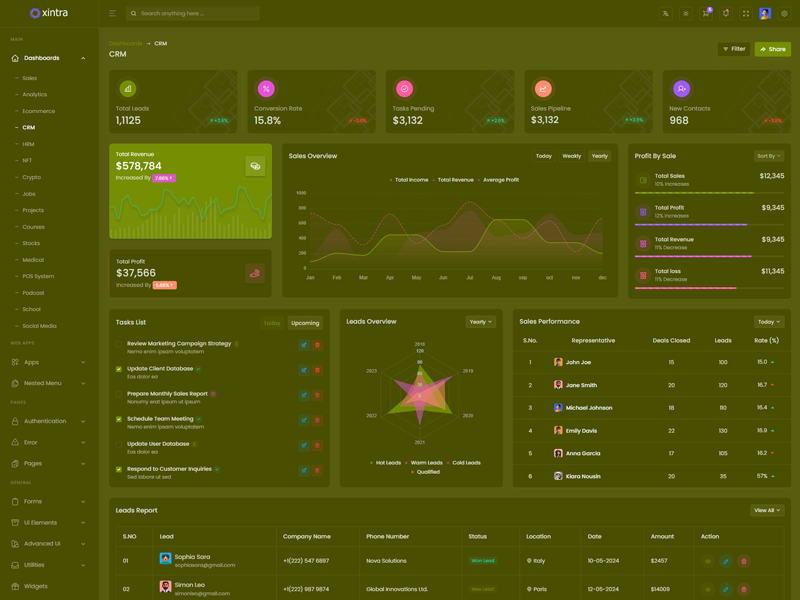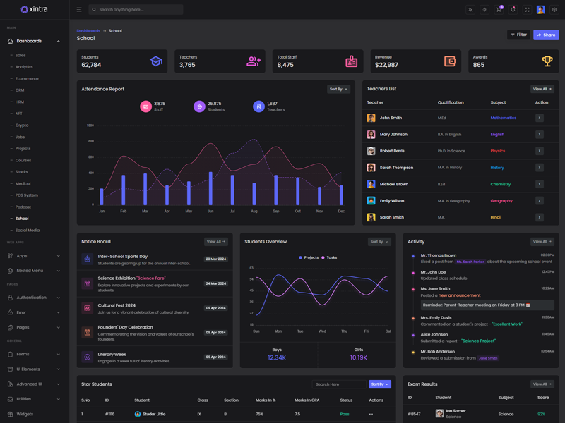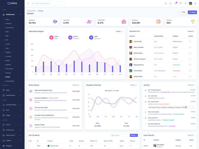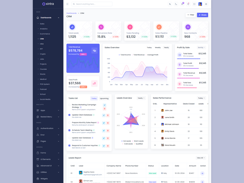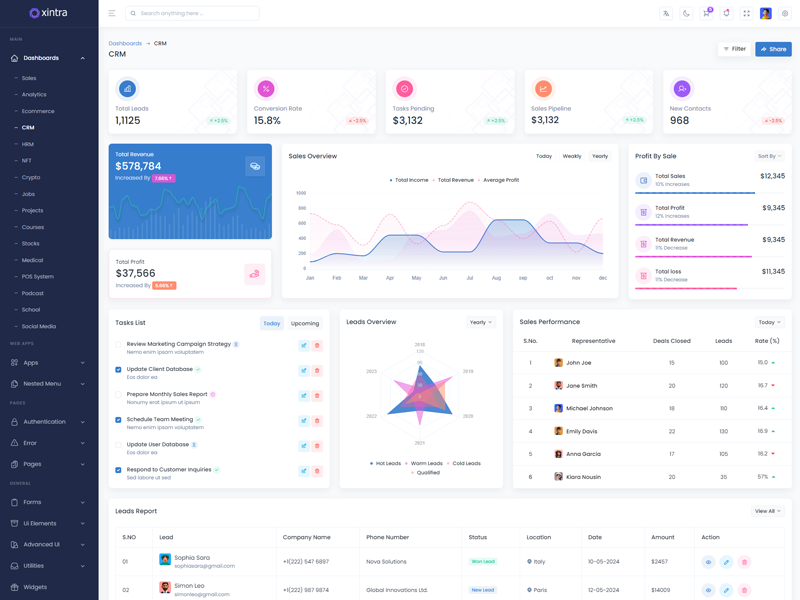 Xintra offers 16 attractive dashboards with various themes for users to customize the Laravel Premium Tailwind CSS Admin Template based on their preference.