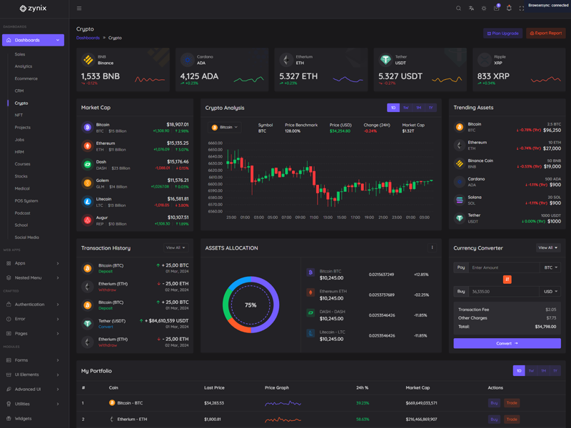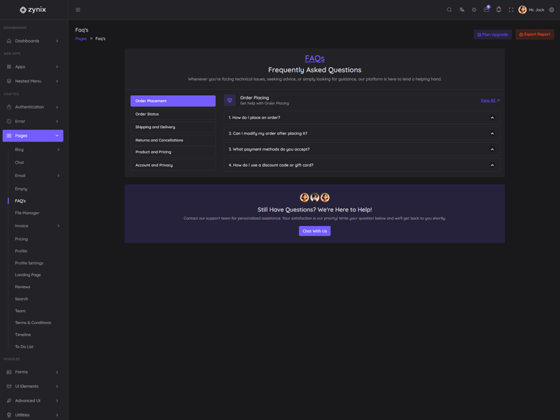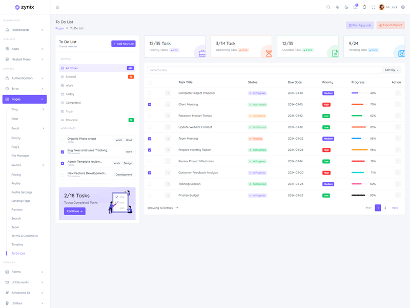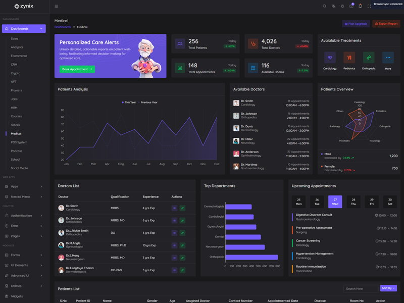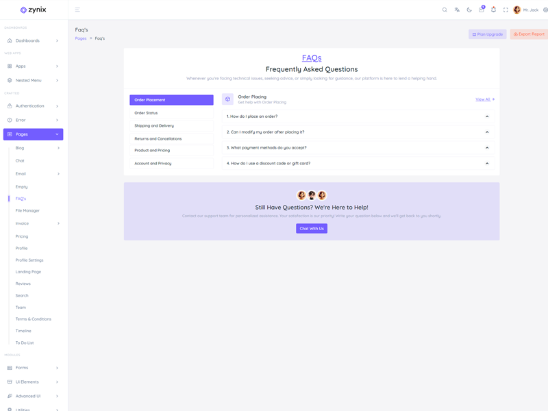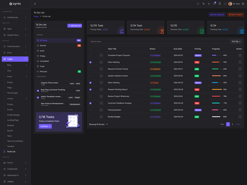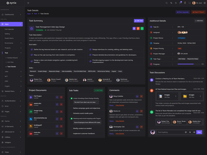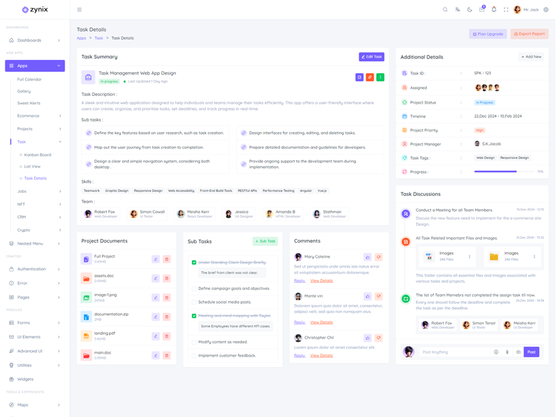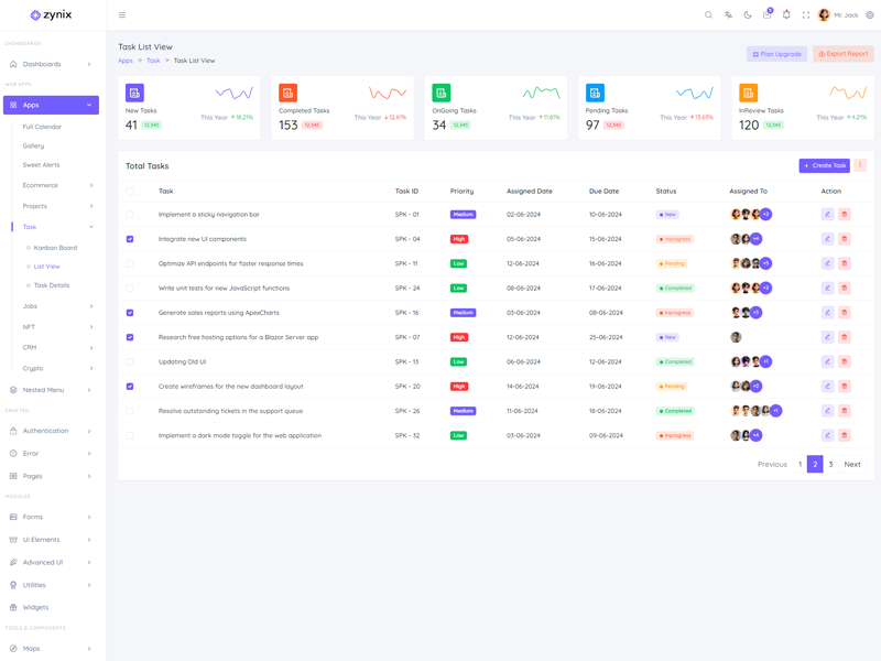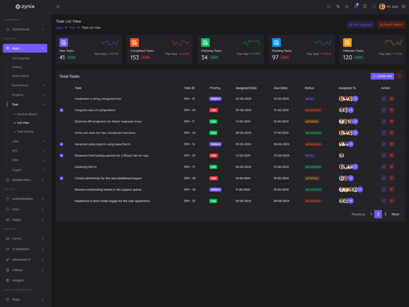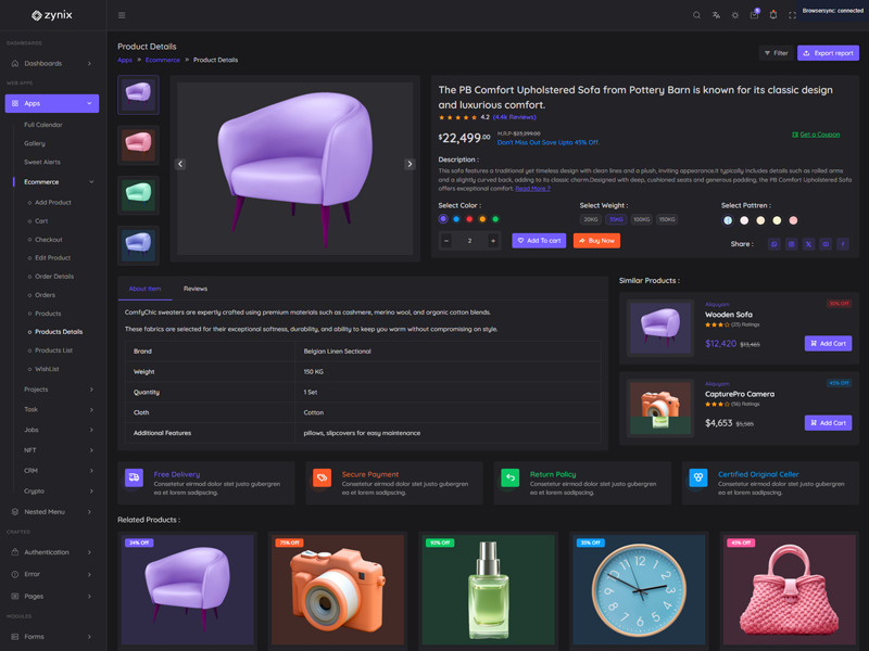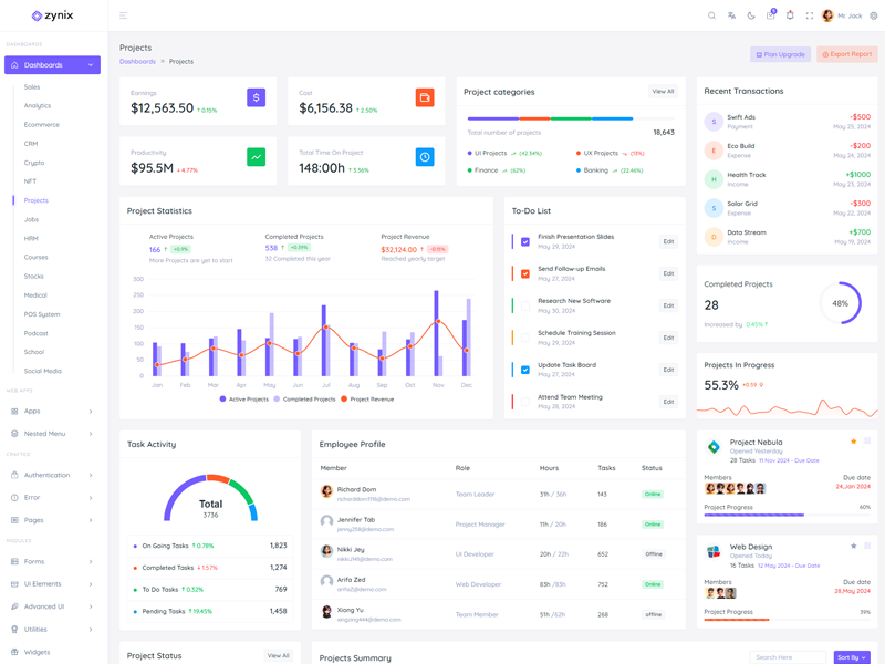 Zynix - Premium Laravel Tailwind Admin & Dashboard Template offers essential features, including high design quality, compatibility with your front-end framework, responsiveness, ease of customization, comprehensive documentation, and dedicated support. Additionally, it comes with integrated plugins and various supplementary features.